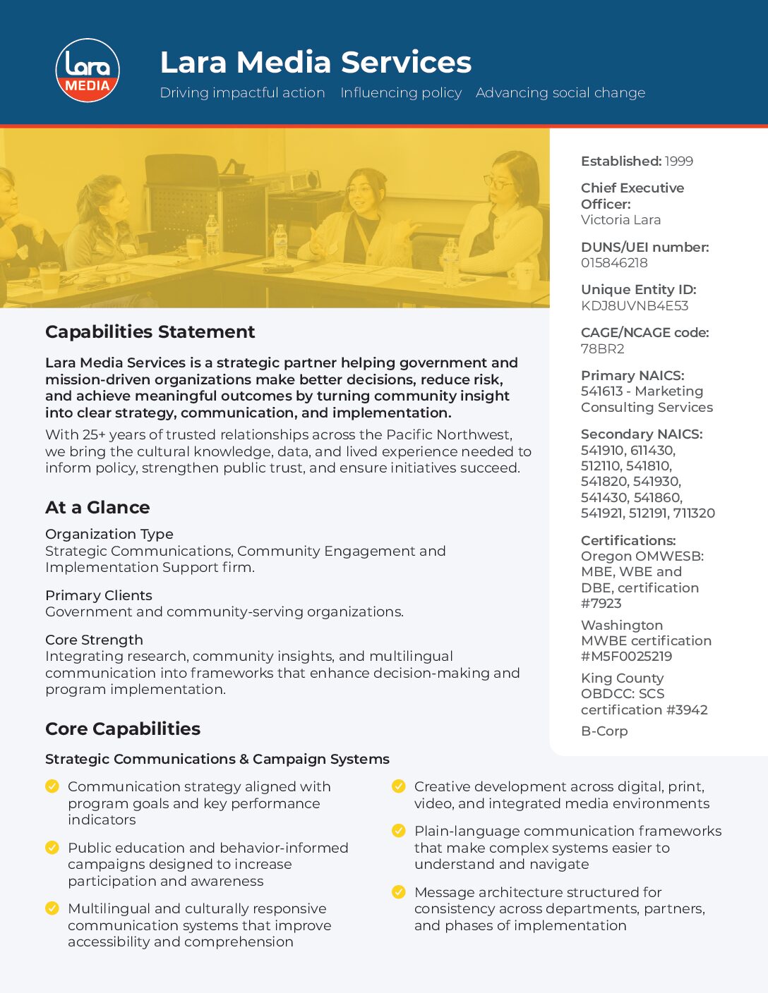 Lara Media Services is a strategic partner helping government and mission-driven organizations make better decisions, reduce risk, and achieve meaningful outcomes by turning community insight into clear strategy, communication, and implementation.